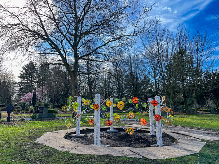 Auf dem Friedhof in Würselen entstand im April 2024 eine kreisrunde „Blätter im Wind“ Anlage mit 5 Kalksteinsäulen und 60 bunten Glasblättern.
