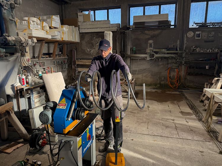 Auf den Bildern ist Mate zu sehen, der das Biegen und Schweißen der Edelstahlrohre mit vollem Körpereinsatz macht.